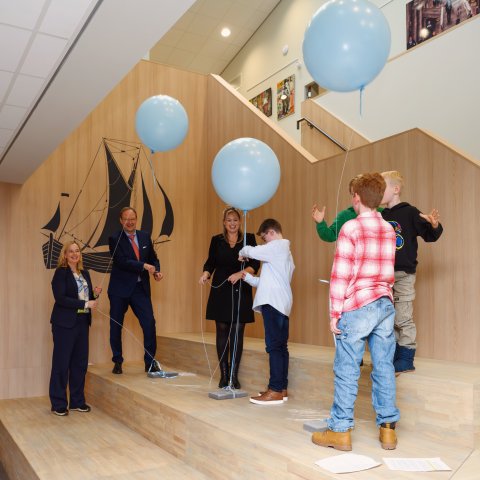 Foto van het doorknippen van de ballonnen voor de opening van o.b.s. ’t Want. V.l.n.r. op de foto: Margreet de Vries, Robert van der Kooi, Roos Vis en de leerlingenraad (Owen, Ian, Dex en Bruce).